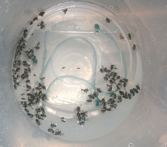 困在捕蠅盤(上方白色處)中的蒼蠅, 因為沒有水與食物,會在一天內風乾死亡; 由於持續會有蒼蠅受費洛蒙吸引進入,所以捕蠅盤中一直會有活的蒼蠅持續釋放費洛蒙吸引周遭的蒼蠅, 周而復始,能不間斷的捕蠅